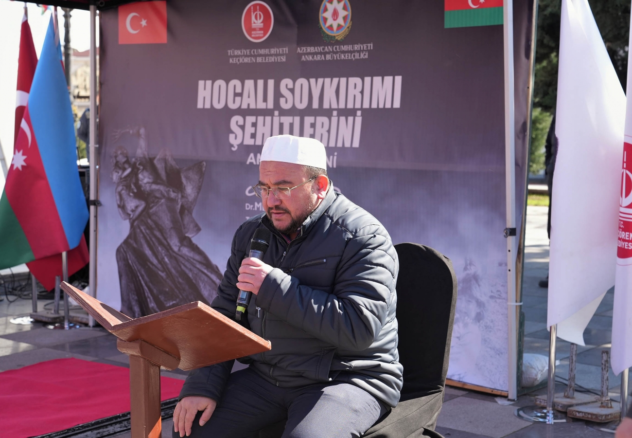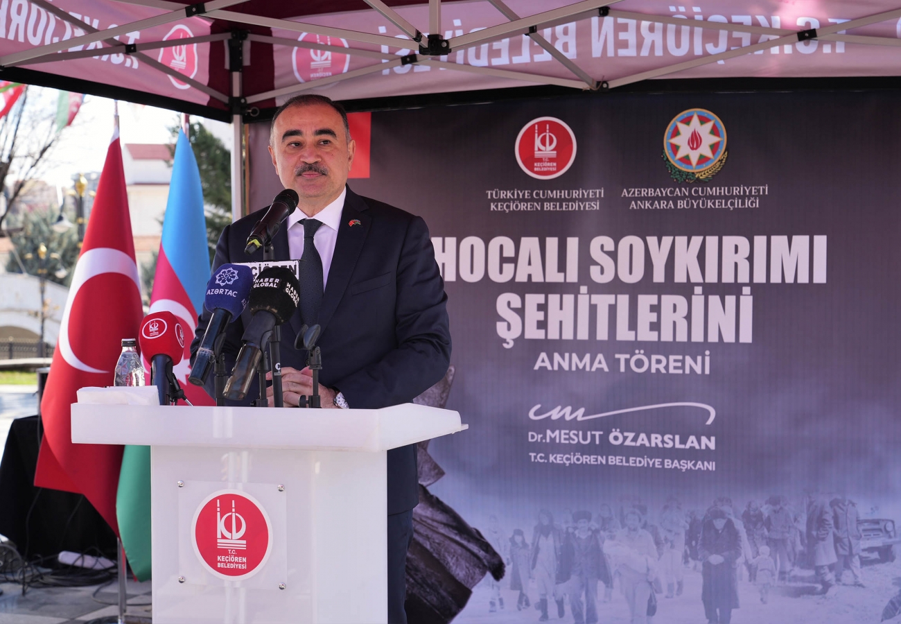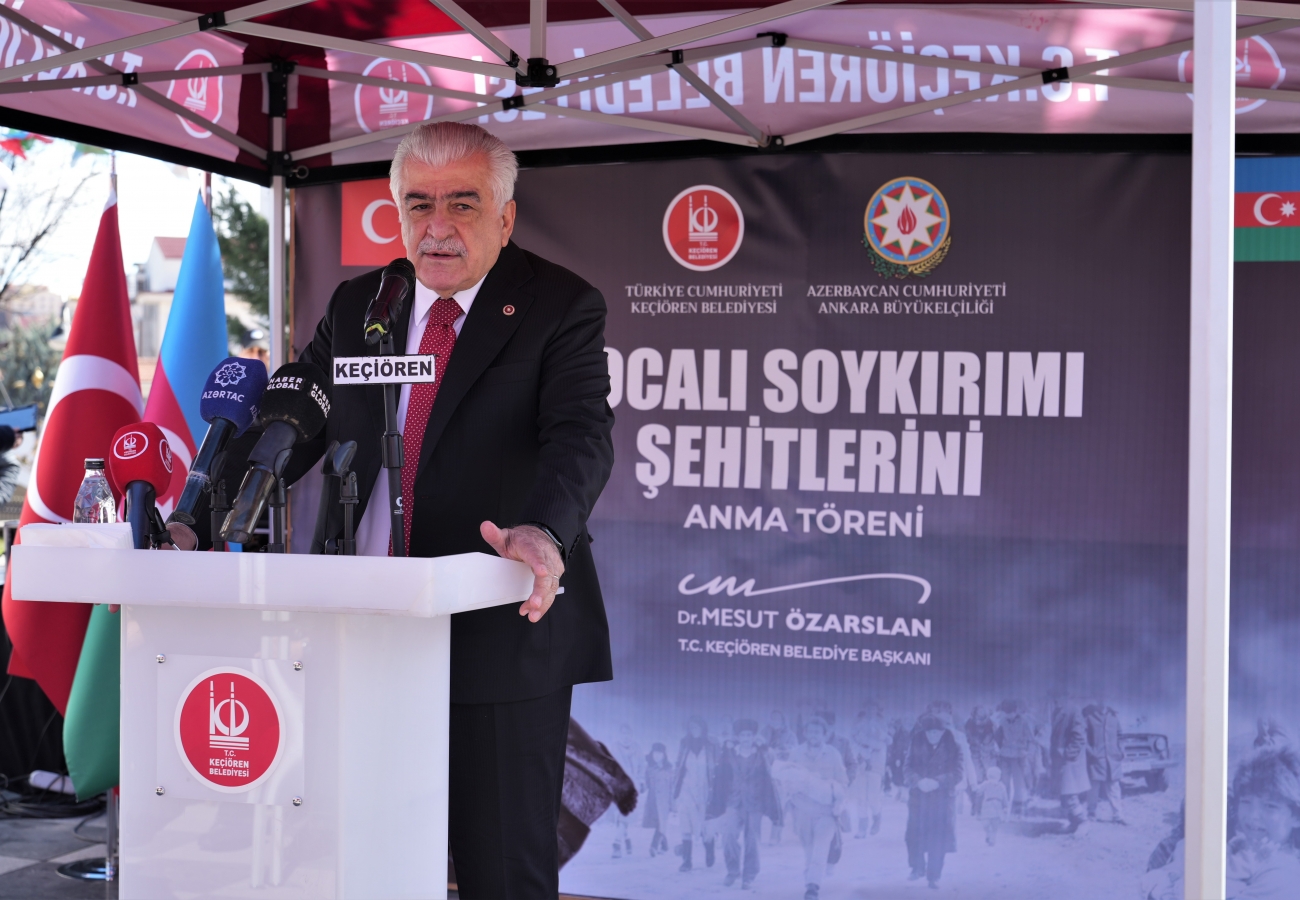 Azerbaycan Cumhuriyeti Ankara Büyükelçisi Dr. Reşad Memmedov, bu acıların unutulmaması gerektiğini belirterek şunları ifade etti: “Sadece milli mensubiyetleri nedeniyle, Türk oldukları için hayatlarını kaybetmiş insanları anmak amacıyla buradayız. Türk milleti olarak bizler, hiçbir savaşta çocukları, yaşlıları ya da kadınları hedef almadık. Hiçbir zaman süngülerimizi, silahlarımızı onlara yöneltmedik. Hocalı Soykırımı 30 yılı aşkın süredir dünya genelinde kitaplarla, yazılarla, fotoğraf sergileriyle, törenlerle ve canlı tanıkların ifadeleriyle anlatılmasına rağmen dünya sustu. Ancak biz bunu unutmayacağız. Bunu unutmamalıyız ki, bir daha çocuklarımıza karşı, insanlık suçları işlenmesin ve bu tür acılara izin verilmesin. Bizler, bu tür felaketlerin başka milletlerde nasıl doğduğunu önceden görmeli, buna karşılık vermeli ve bir daha böyle cinayetlerin tekrarlanmaması için adımlar atmalıyız. Keçiören Belediye Başkanımıza ve programın düzenlenmesinde emeği geçen herkese minnettarım. Keçiören Belediyesi, Azerbaycan`ı hiçbir zaman unutmadı. Hem savaş zamanında, hem savaş sonrası hem de bugünlere kadar Azerbaycan`ın yanında oldular. Teşekkür ederim, var olun, eski olmayın.”
