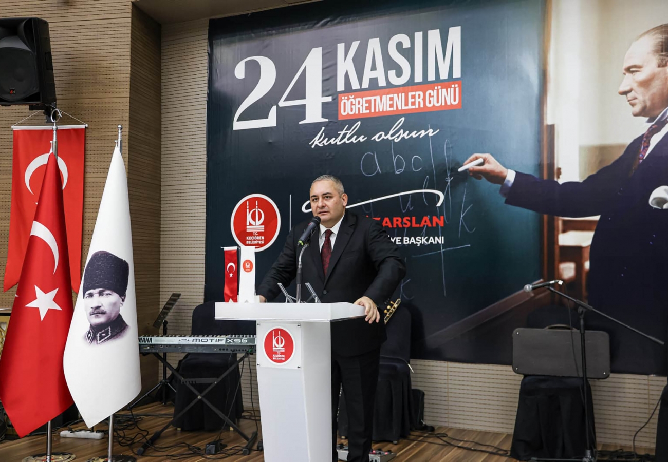 Öğretmenlere hitaben yaptığı konuşmada, Başöğretmen Gazi Mustafa Kemal Atatürk tarafından gerçekleştirilen yeniliklerle birlikte toplumdaki okuma yazma oranının arttığını ve cehaletle önemli ölçüde mücadele edildiğini vurgulayan Keçiören Belediye Başkanı Dr. Mesut Özarslan, şu mesajları paylaştı: “Bu ülkenin bütün mili ve manevi değerleriyle bugün hepimiz bulunduğumuz evimizde, iş yerimizde Kur`an-ı Kerim’i okuyabiliyorsak, ilmihalinden faydalanabiliyorsak, namazlarımızı da hür irademizle kılabiliyorsak, işte bunun adı Gazi Mustafa Kemal Atatürk’tür. Onun adı ‘Başöğretmen’dir. Bunu herkes böyle bilecek! Bizlerin Ali Efendimiz gibi elif gibi dimdik durmayı bilen bir millet olma özelliğimiz var. Hak ve hakkaniyet yolunda ilerleyen bir yapımız varken bu millet ve bu millete sahip çıkacak olan Cumhuriyetimiz ilelebet payidar kalacaktır. Kıymetli öğretmenlerim, bu gelecek nesiller hem fikri hem vicdanı hem de irfanı hür bir şekilde sizlere emanet olacaktır. Buradaki o fikir, o vicdan, o irfan dediğimiz değerleri gelecek nesillere aktaracak olan siz öğretmenlerimiz olacaksınız. Bunu gerek matematikte, gerek fen bilimlerinde, gerekse o güzel Türkçemizin kazandırılmasında göstereceksiniz. Yüce Türk milletinin asil kültür kodlarını kendi ürettiği iğne oyasında bulacaksınız. Onu yeri geldiğinde sizin dokumalarınızda, sizin el işçiliklerinizde göreceksiniz. İşte bunların hepsi sizlere emanettir. Onun için sizlerle onur ve gurur duyuyorum. İyi ki varsınız öğretmenlerim. Bizler de bu duygu ve düşüncelerle, sağ olsun ifade edildiği gibi, ben de öğretim görevliliği yapmış, bu ülkeye inşaat mühendisleri kazandırmış bir geçmişe sahip olmaktan onur ve gurur duyuyorum. Bu doktora öyle boşu boşuna alınmadı hemşerilerim. Bunlar bu millet için, eğitimde kullanılmak üzere, insanlığa hizmet vermek için alınmıştır. Başta Başöğretmen Ulu Önderimiz Gazi Mustafa Kemal Atatürk’ümüz olmak üzere tüm öğretmenlerimizin Öğretmenler Günü’nü kutluyorum. Ne mutlu Türk’üm diyene.”